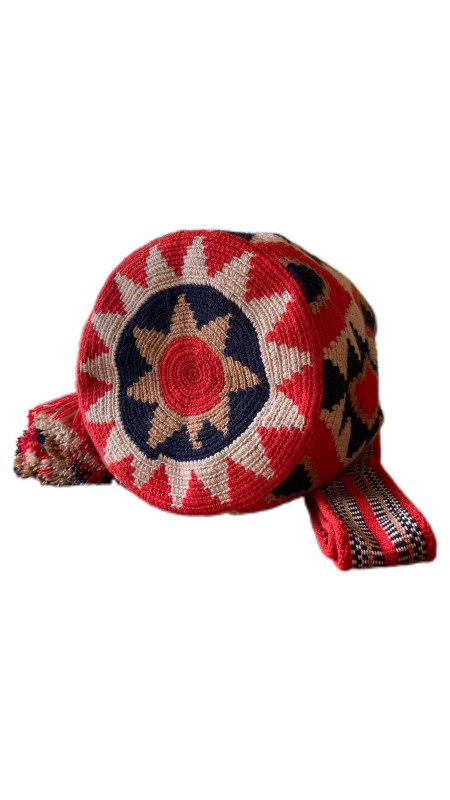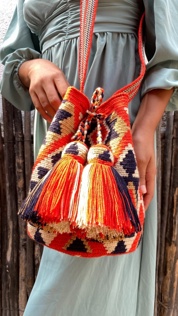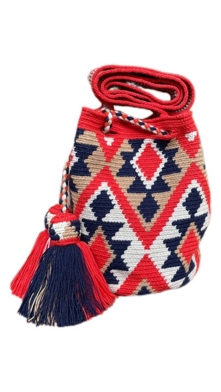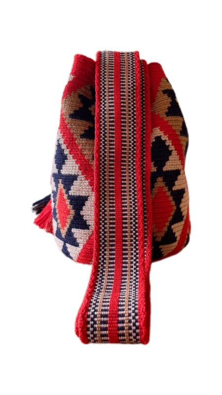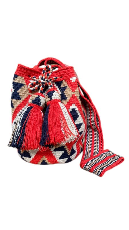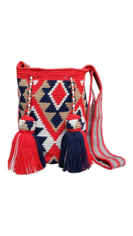 MOCHILA DE DISEÑO DE 2 HEBRAS ELABORADA 100% EN POLIESTER, CON GASA PALETEADA, CORDON TRENZADO, FLECOS Y GORRITO CON DISEÑO.